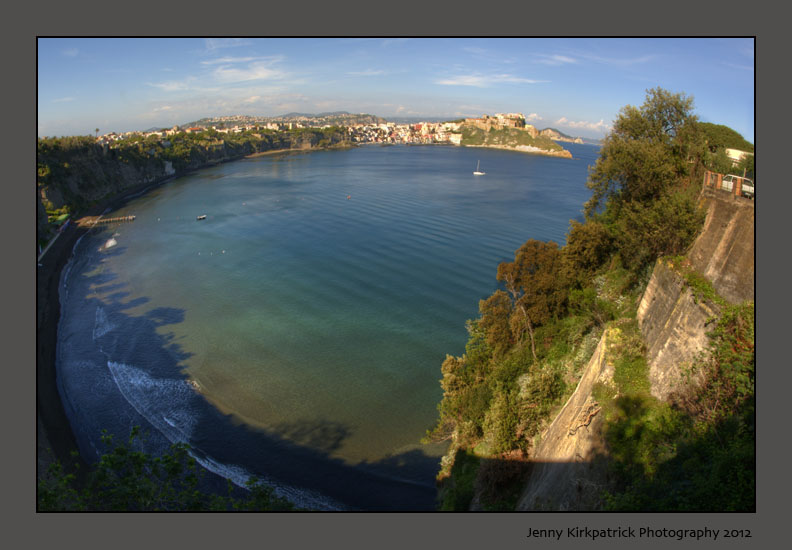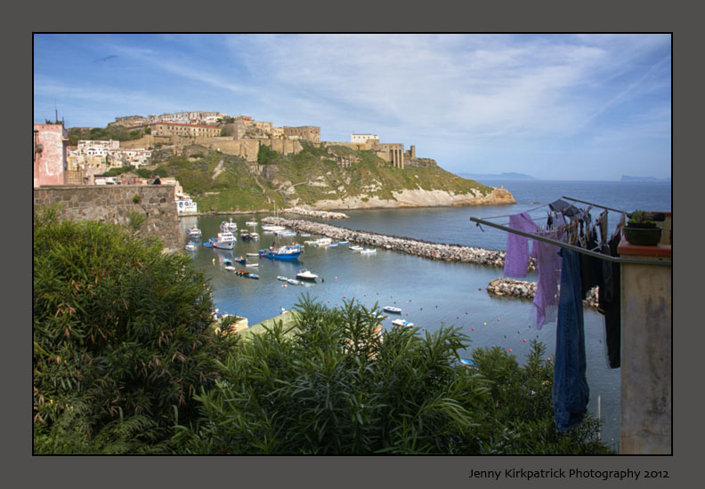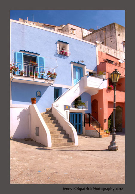 The tiny Island of Procida (often overshadowed by its more popular cousin, the nearby Isle of Capri) is about 4 square miles, and an easy half hour ferry ride from the insanity of mainland Naples, Italy. The ferry drops everyone at the Porto, a bustling marina surrounded by a colourful shopping and restaurant area. The buildings, as in many other small Italian coastal towns, are brightly painted pastels…Many, with obvious pride of ownership, are draped with hanging and potted flowers. Ubiquitous laundry flutters outside many windows.